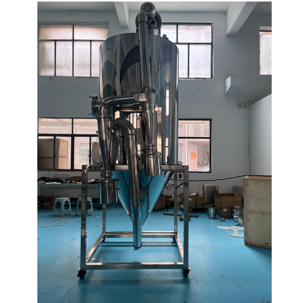 喷雾干燥机是空气通过过滤器和加热装置后,进入干燥室顶部的热风分配器,通过热风分配器的热空气均匀的进入干燥室内,并呈螺旋状转动,同时将料液送到装置在干燥室顶部的喷雾头,料液被喷成绩效的雾状液滴,使料液和热空气接触的表面积大大增加,水分迅速蒸发,在极短的时间内干燥成品。较粗的成品由干燥器底部的收集筒回收,废气由离心风机排出。